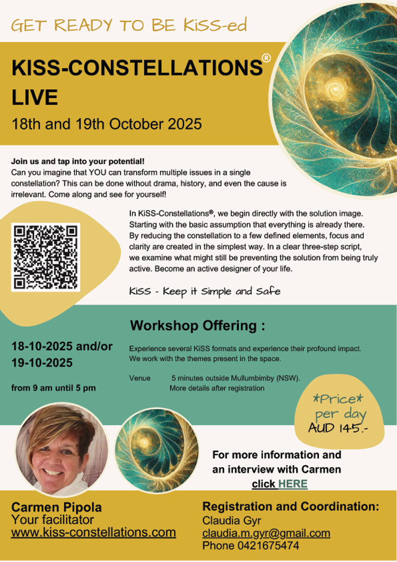 Systemic and Family Constellation work, first introduced by Bert Hellinger, explores the systems we live in and the impact they have on our lives. It brings awareness to relational entanglements in intimate relationships, family, work place and to related health issues. This process supports experiential integration of unacknowledged parts of our systems and within ourselves leading to long lasting positive effects. This process too is very somatic and experiential connecting us to a deep sense of being part of a bigger field.